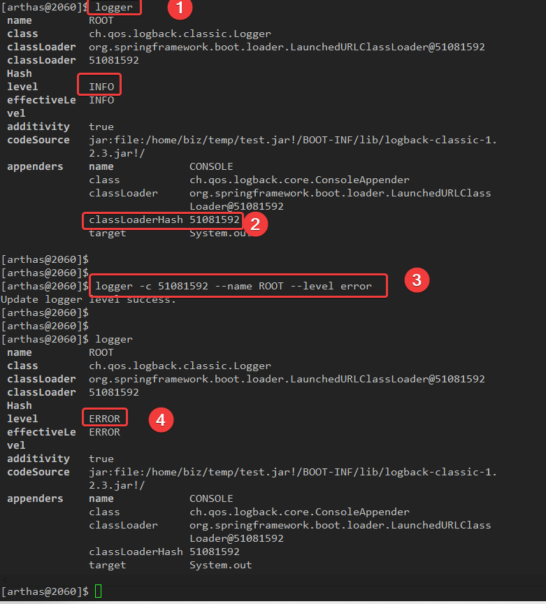 -- logger -c 클래스로더의해시--name ROOT --level debug